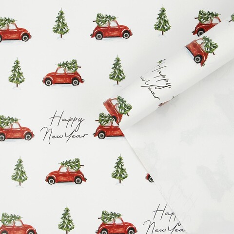 Упаковочная бумага глянцевая, «Happy New Year» Машина с елкой, 0,7*1 м, 5 листов