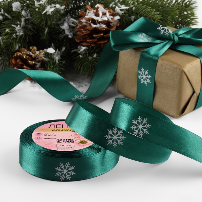 Лента Атласная (2,5см*23±1м), «Снежинки», Зелёная, 1 шт.