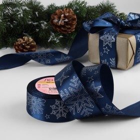 Лента Атласная (4см*23±1м), «Снежинки», Тёмно-синяя, 1 шт.