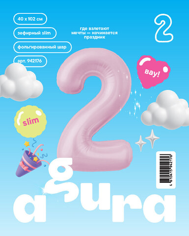 Аг 40''/102 см, Цифра Slim Зефирный "2" (в упаковке)